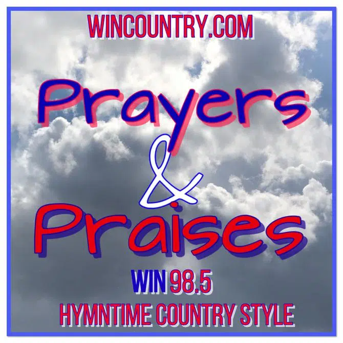 WIN 98.5 Hymntime Country Style Sundays' Jim Williams and Julie Anne are looking to hear from you! Prayer time is at 9:30am on Sunday mornings. We would love to pray for your needs. If you have a praise report, by all means, tell the world about what the Good Lord has done for you! Leave your prayer request or praise report in the comments below!