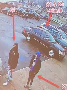 Video surveillance footage gathered by authorities showed the two suspects following the victim into the store where witnesses say they appeared to be having a conversation. Surveillance footage then showed the two suspects once again following the victim out of the store, exchanging words while the victim walked back to his vehicle. The two suspects then took defensive positions, each brandishing a firearm, and shot into the direction of the victim who was able to drive away.